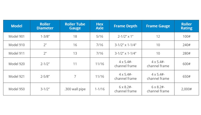 Roller Diameter 2"; Roller Tube Gauge 13; Hex Axle 7/16; Frame Depth 3-1/2" x 1-1/4";